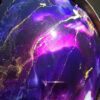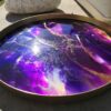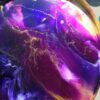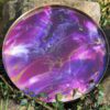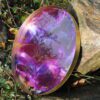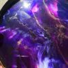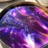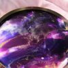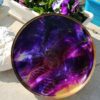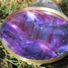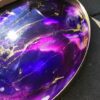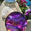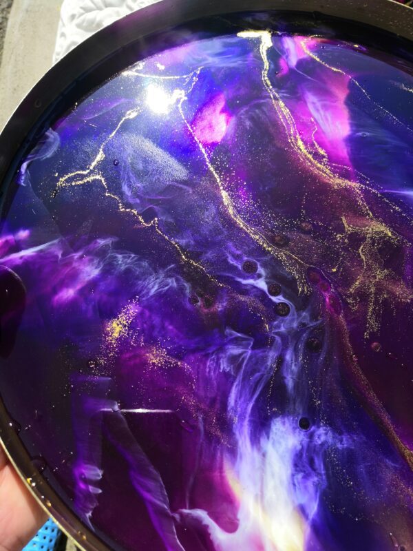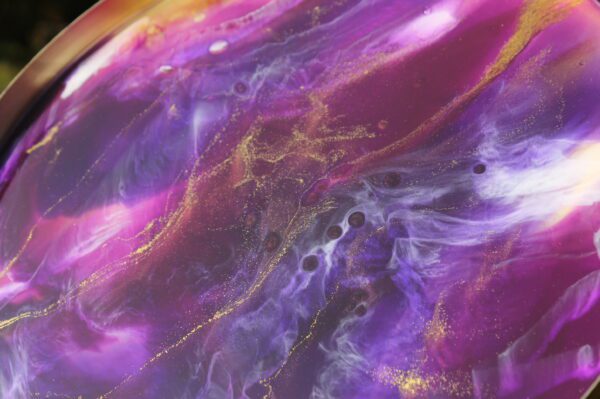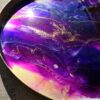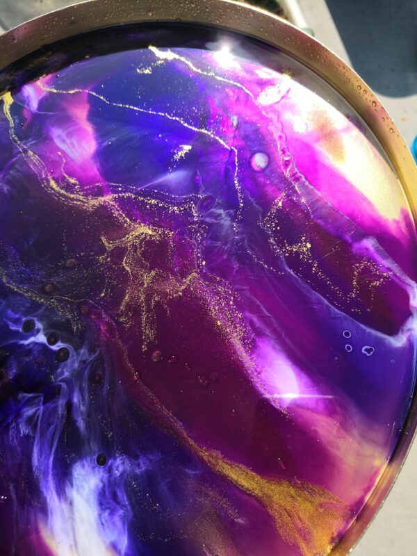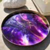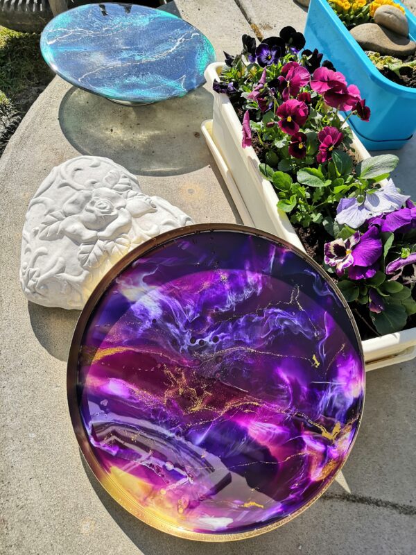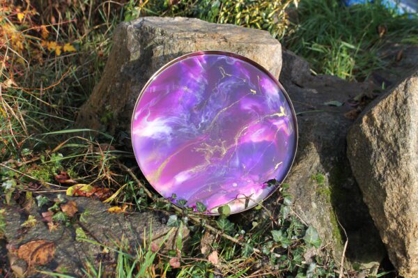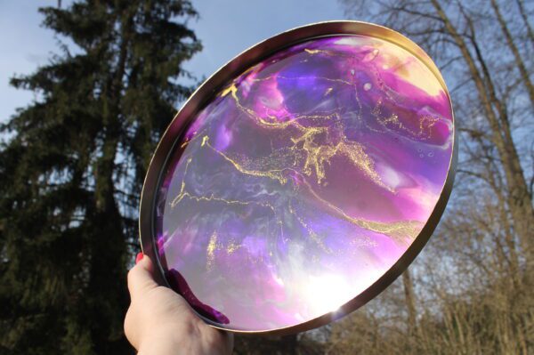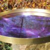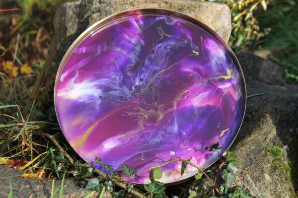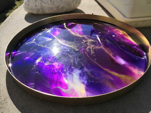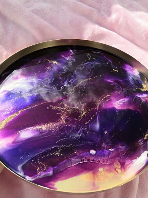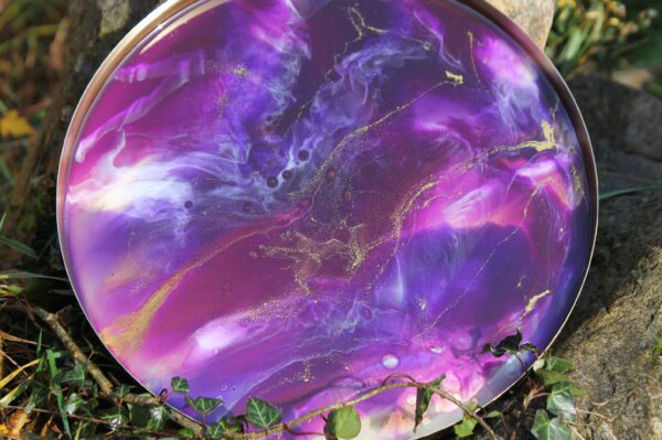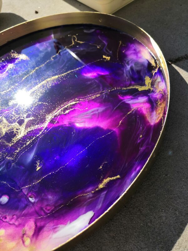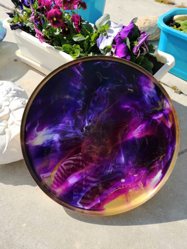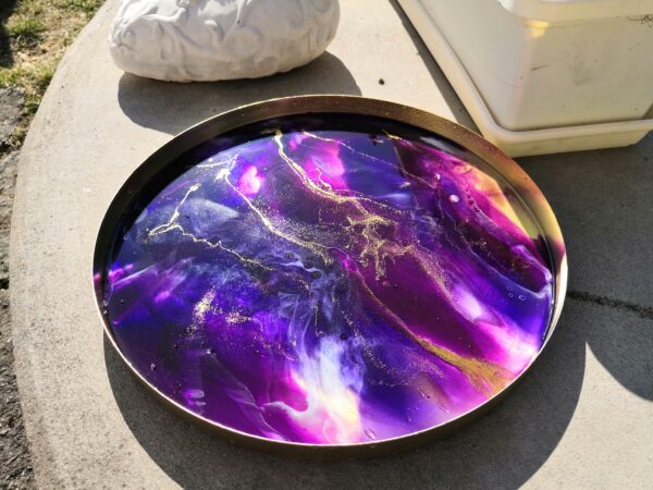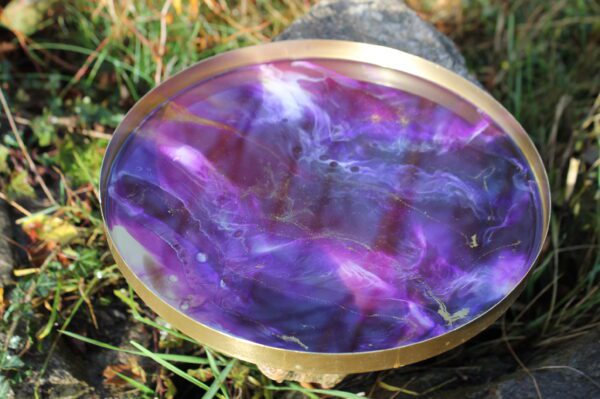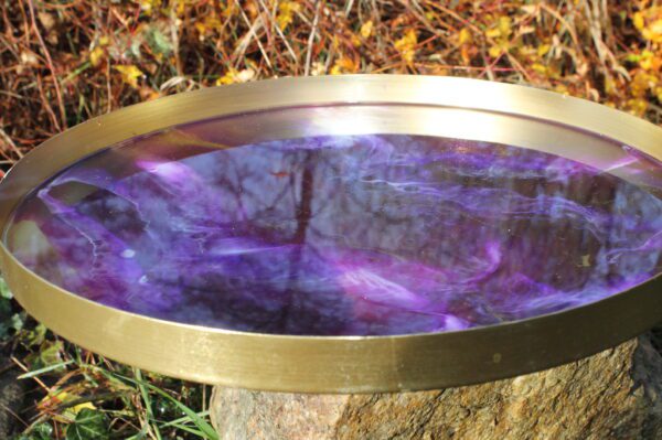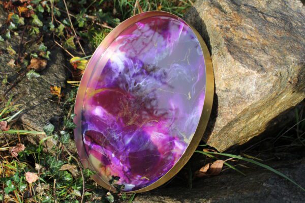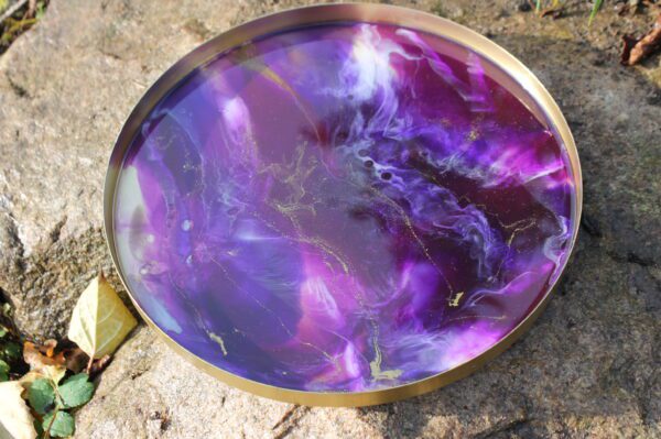 Tác z epoxidové pryskyřice Amethyst. Je zalitý speciální vrstvou odolnou vůči oděru a teplu. Kovový tác v barvě zlaté mosazi je o průměru 30cm a výšce 2cm.