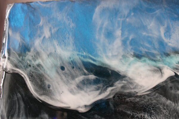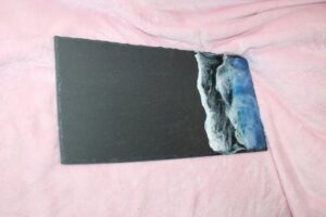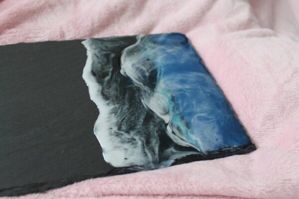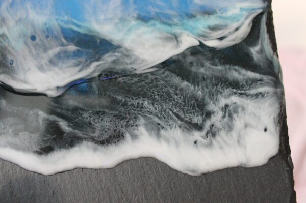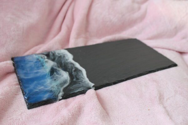 Servírovací tác z břidlice politý epoxidovou pryskyřicí motiv moře. Vrstva speciální pryskyřice oděru a teplu odolná, atest na styk se studenými pokrmy.