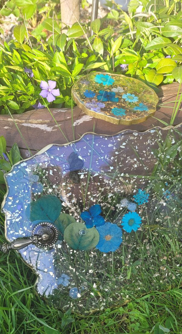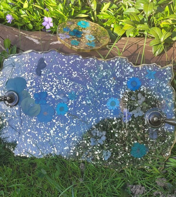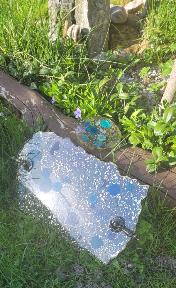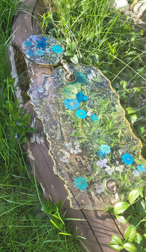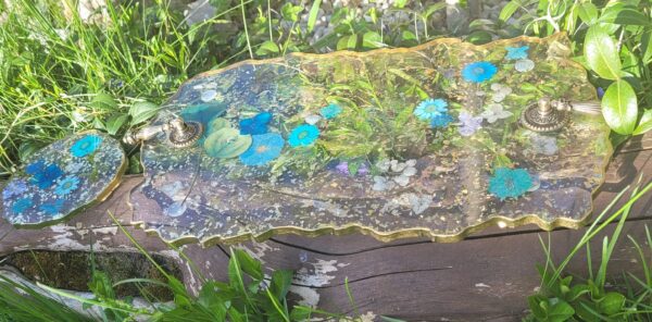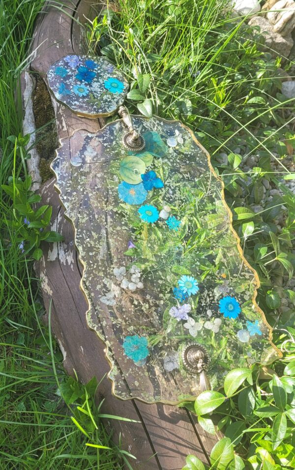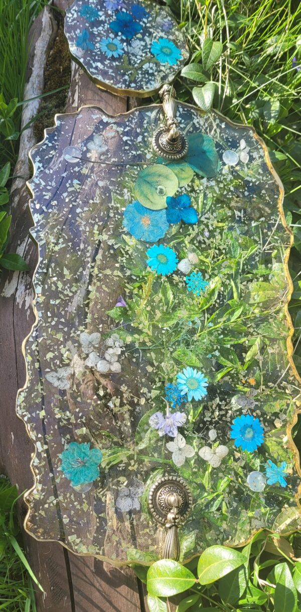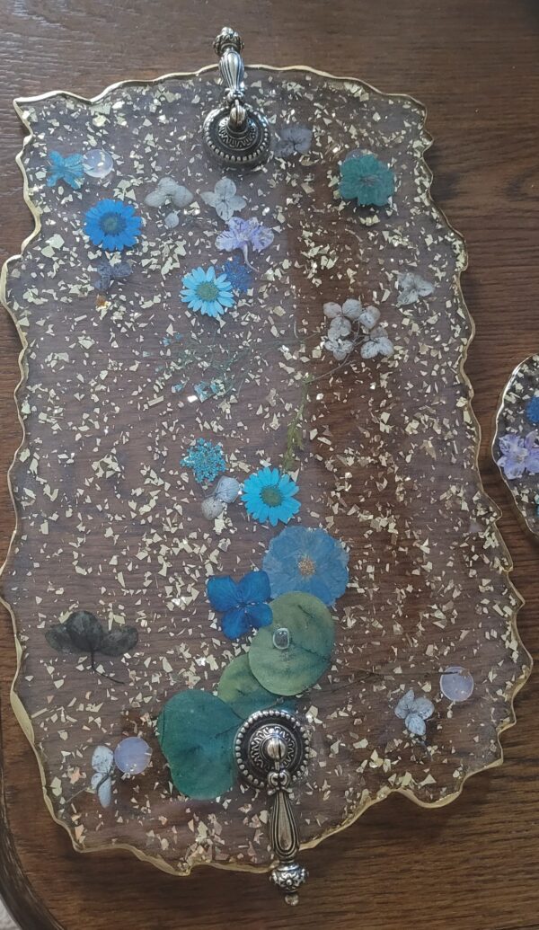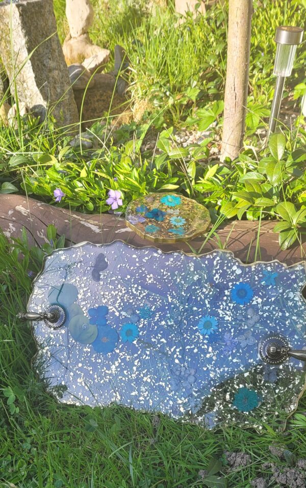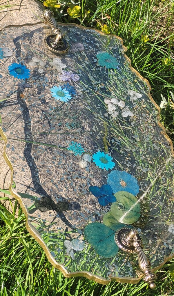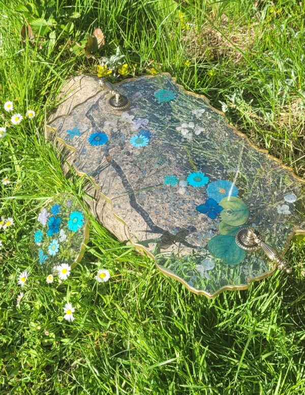 Průsvitný tác z epoxidové pryskyřice se sušenými květy je potažen speciální teplu a oděru odolnou vrstvou. Mosazné úchyty po obou stranách a silikonové podložky na spodní straně.