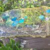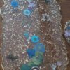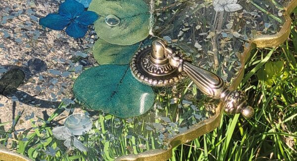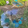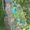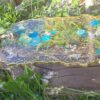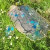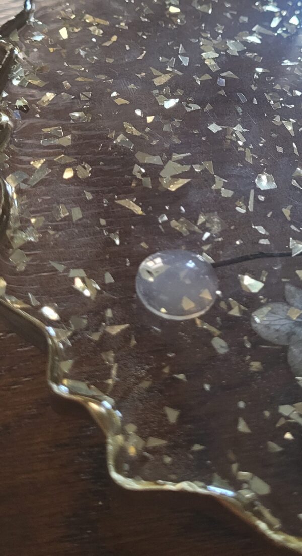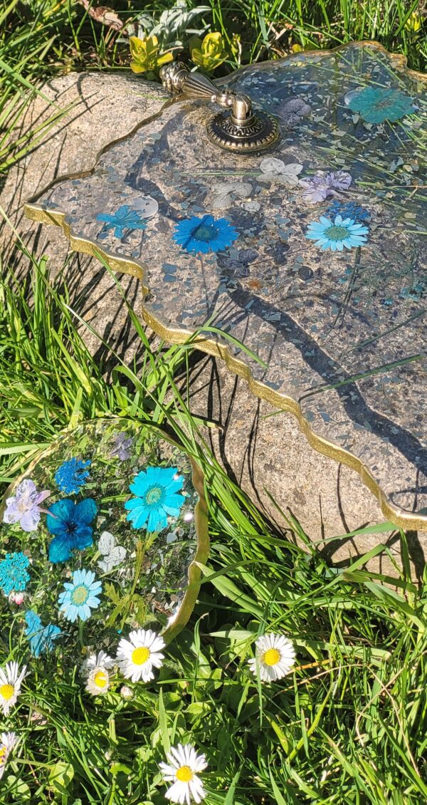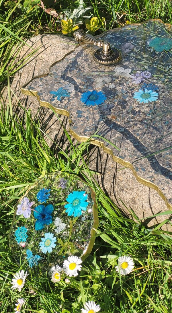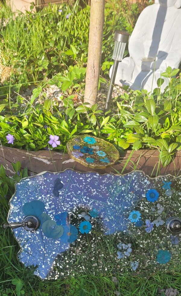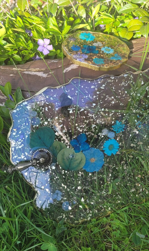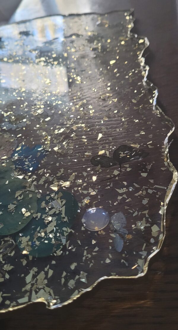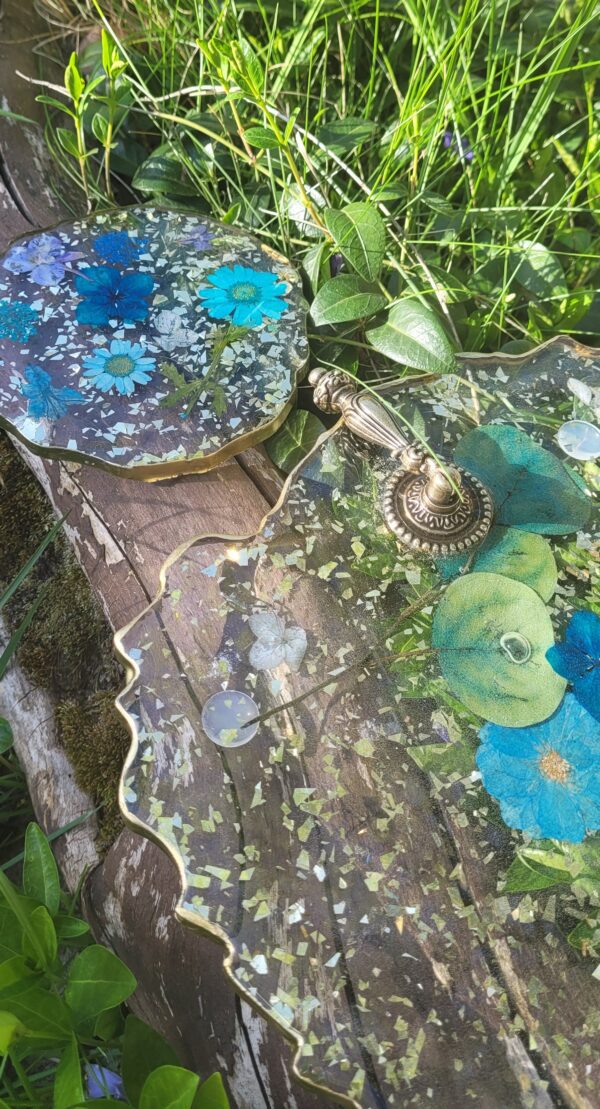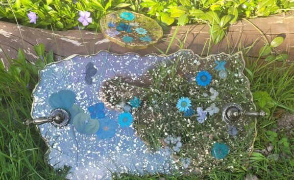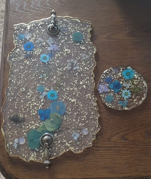 Průsvitný tác z epoxidové pryskyřice se sušenými květy je potažen speciální teplu a oděru odolnou vrstvou. Mosazné úchyty po obou stranách a silikonové podložky na spodní straně.