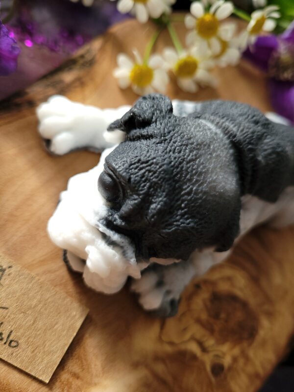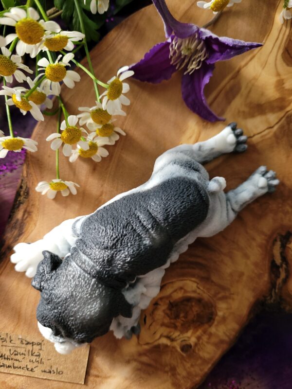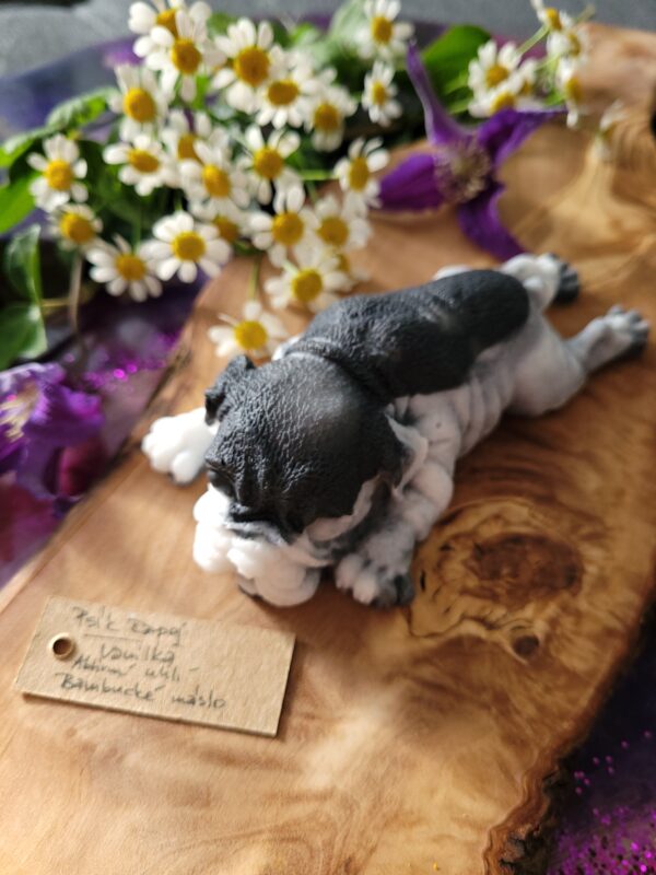 Roztomilé dekorační mýdlo pejsek s vanilkovou vůní, bambuckým máslem a aktivním uhlím.