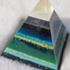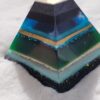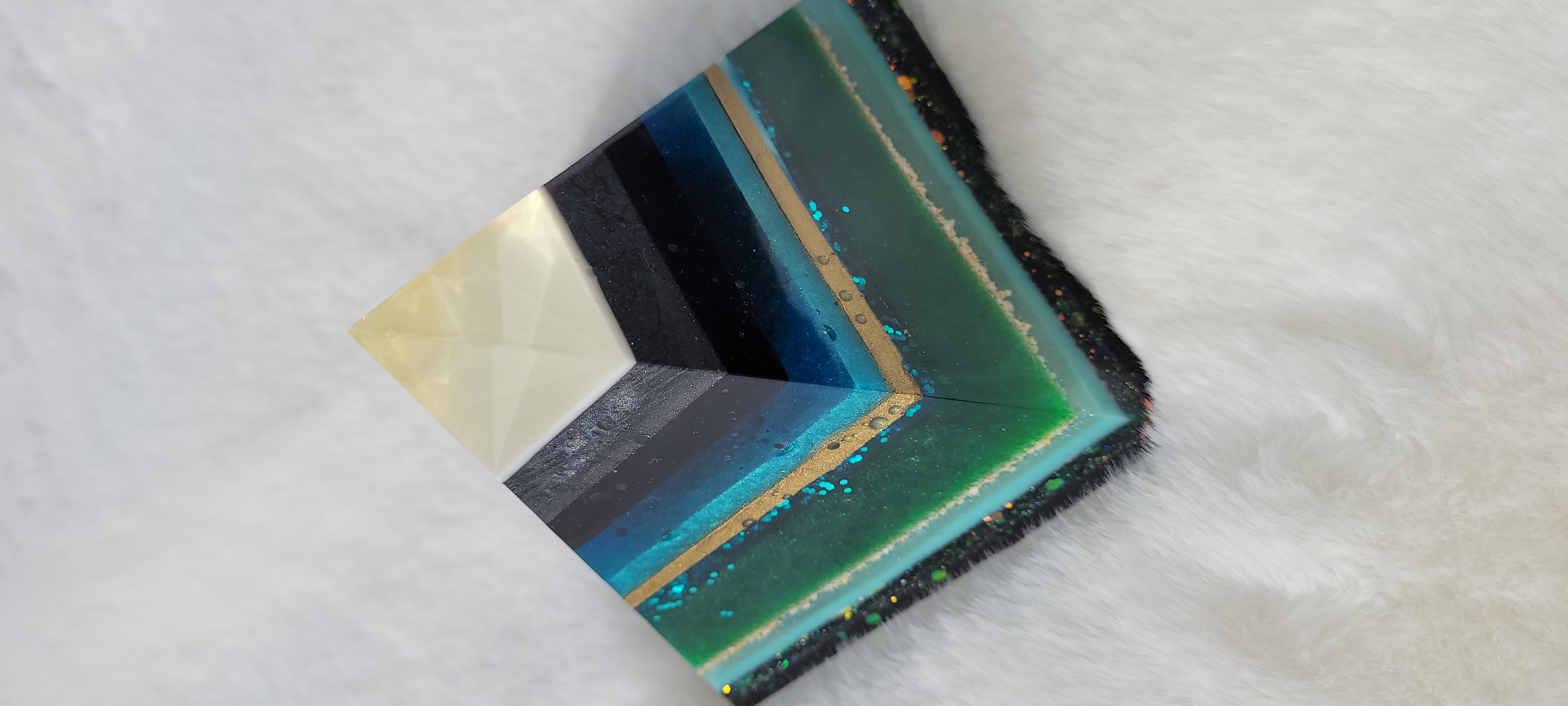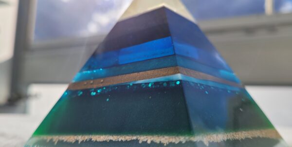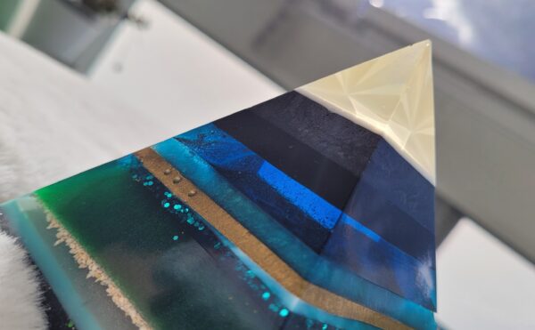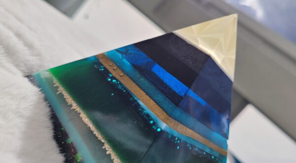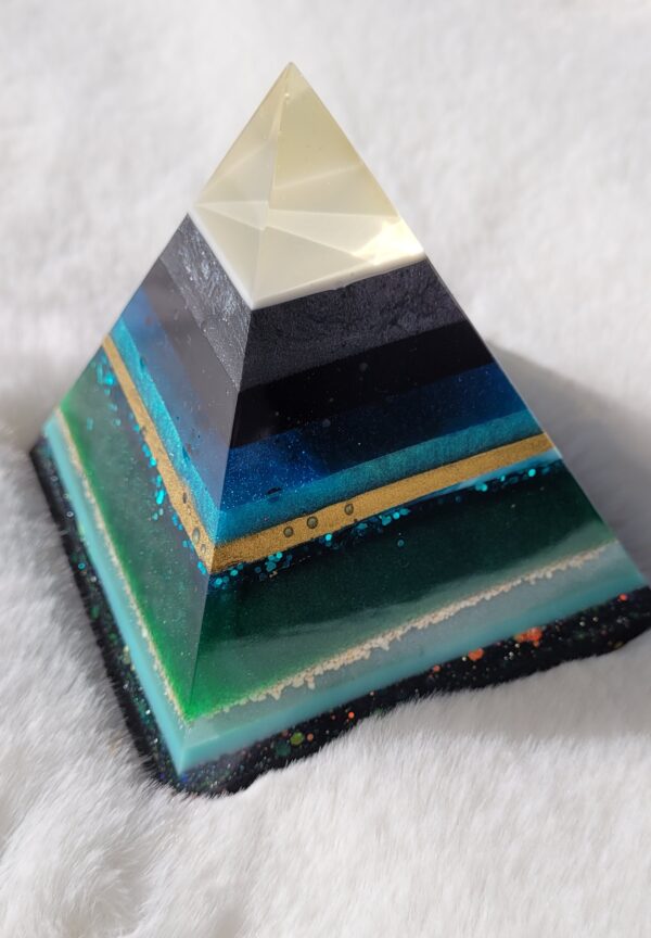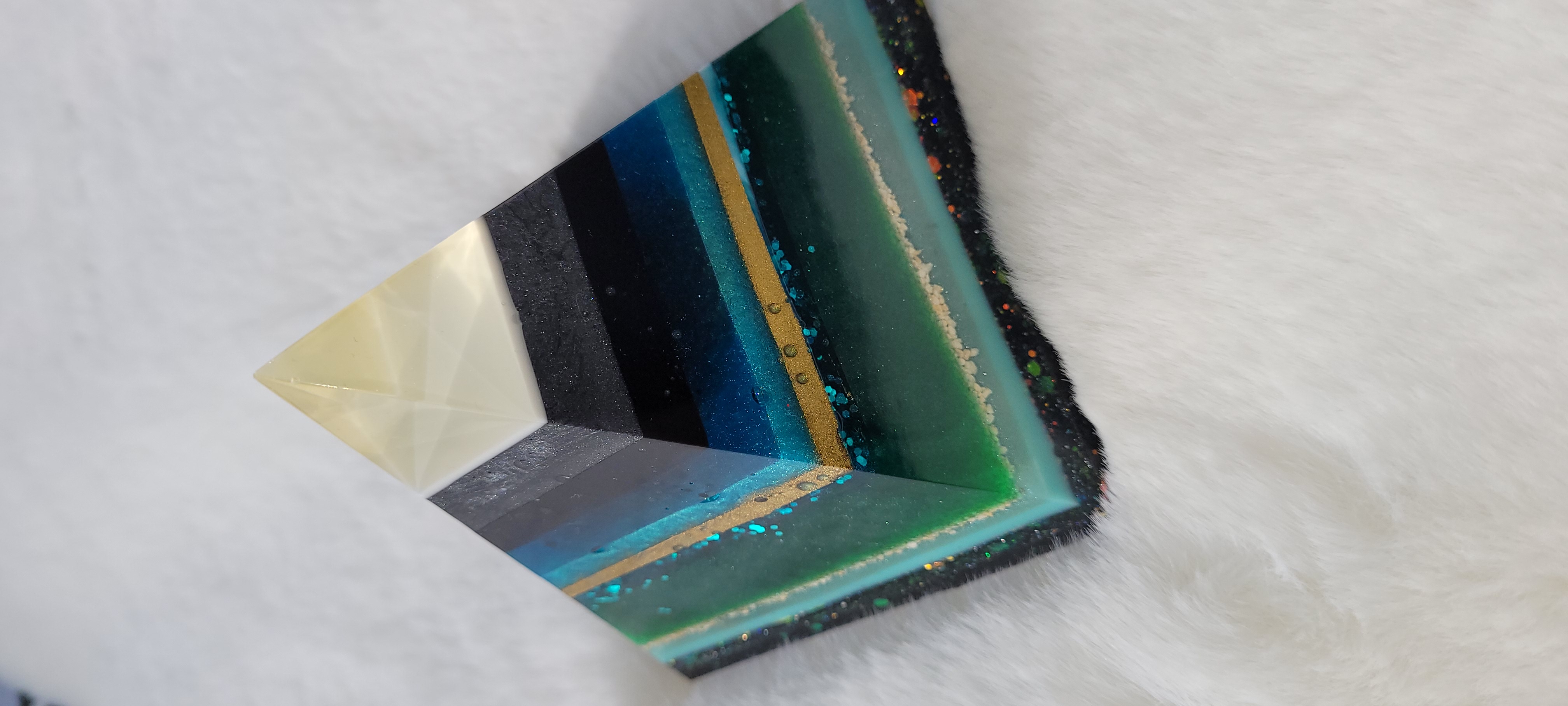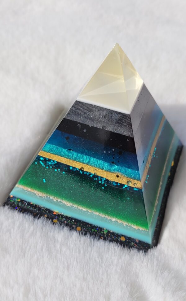 Pyramida z epoxidové pryskyřice se základnou 10x10cm a výškou cca 11cm.