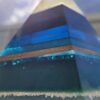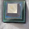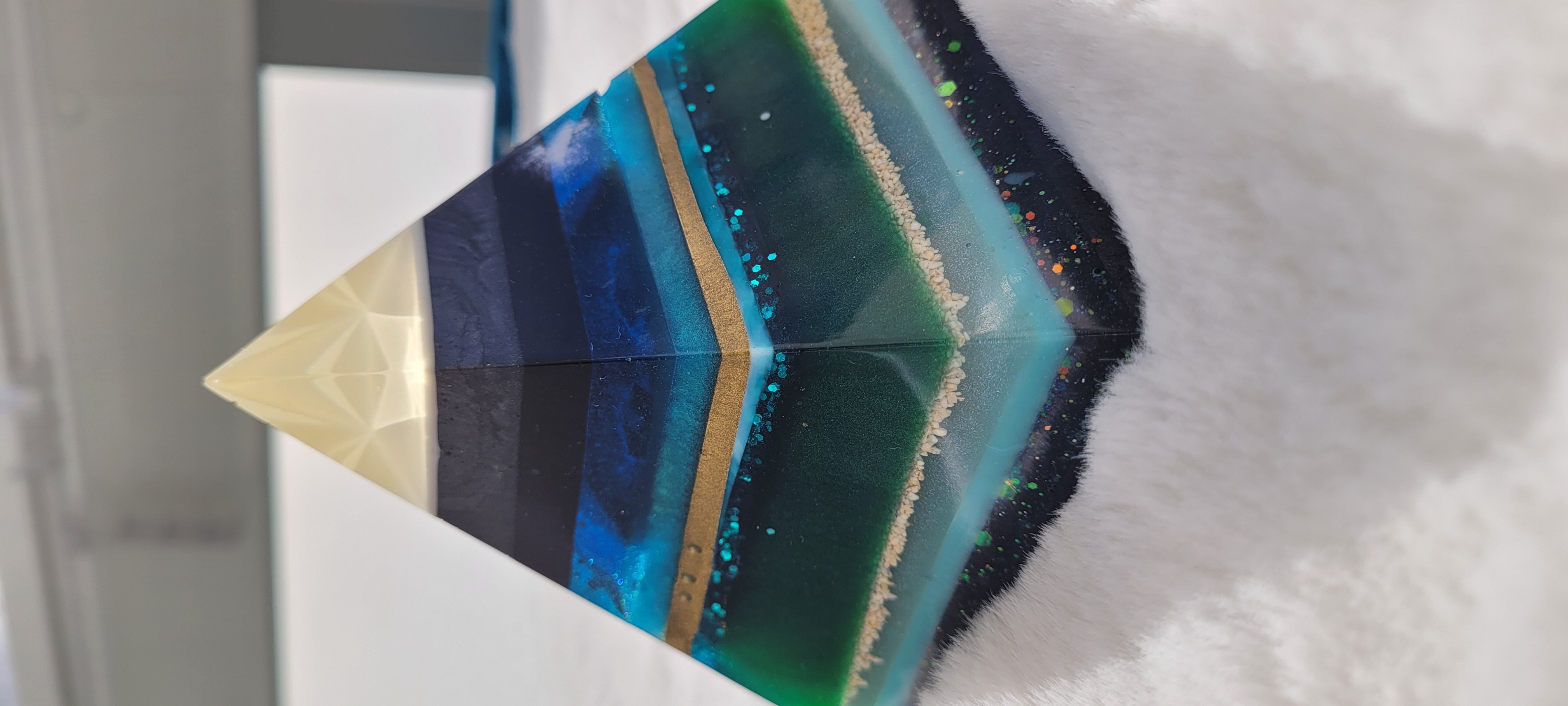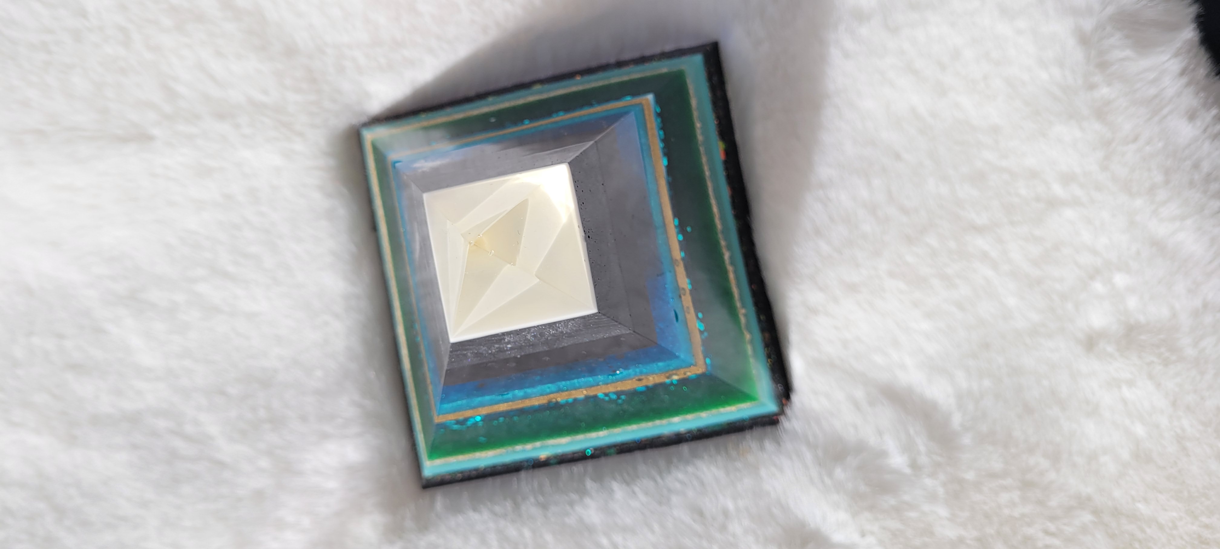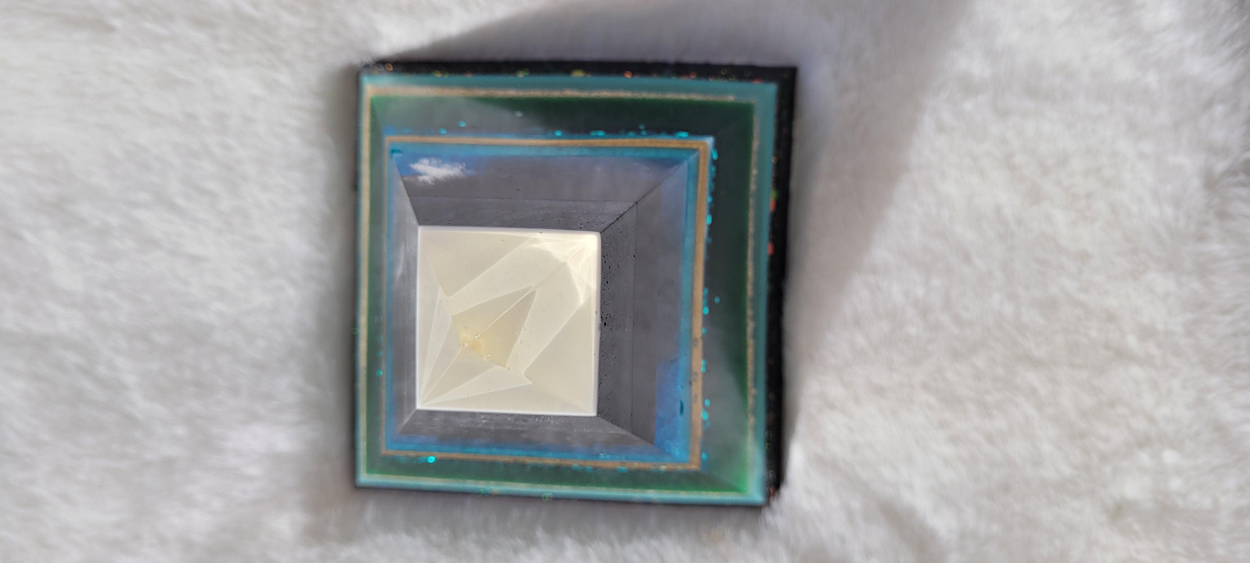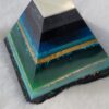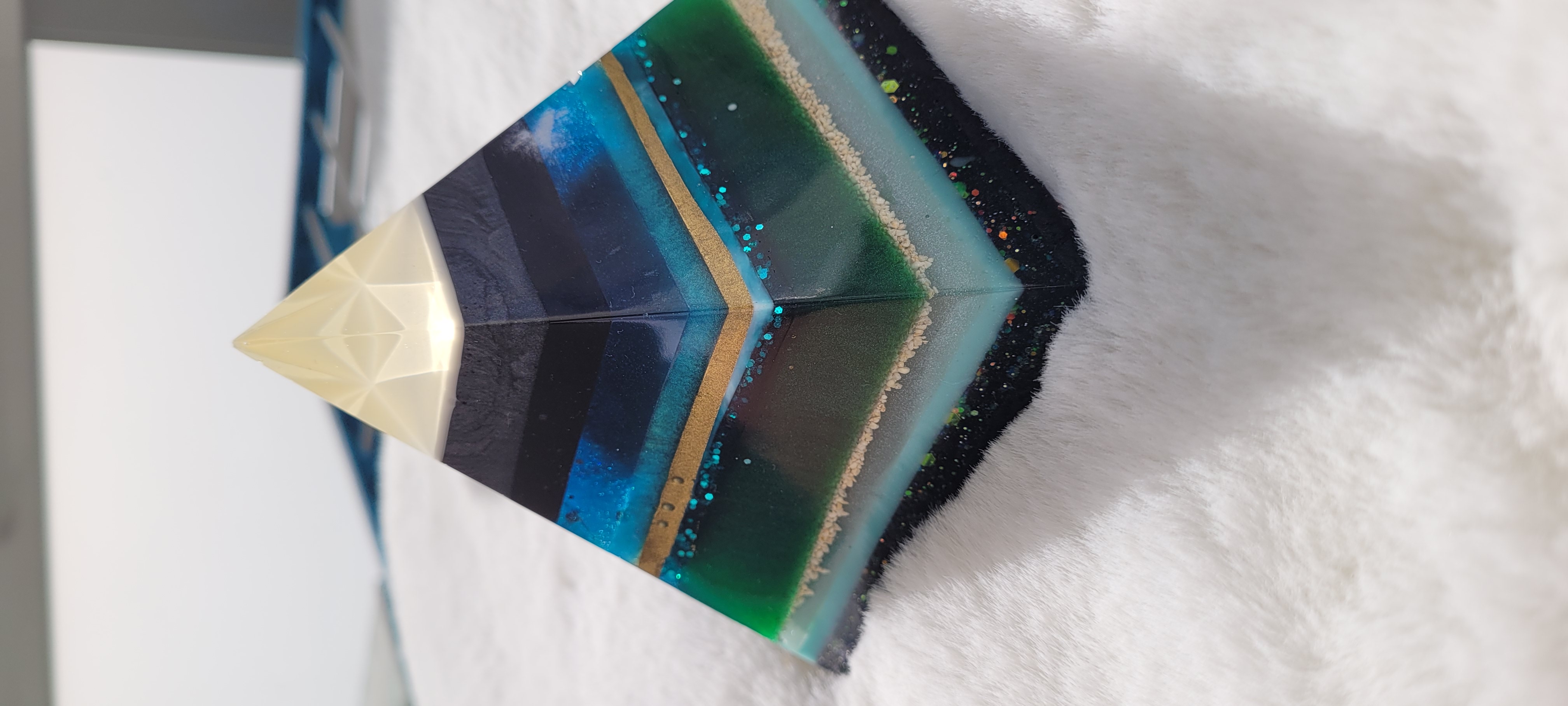 Pyramida z epoxidové pryskyřice se základnou 10x10cm a výškou cca 11cm.