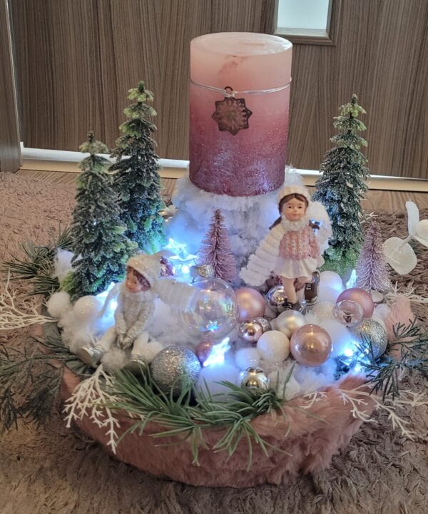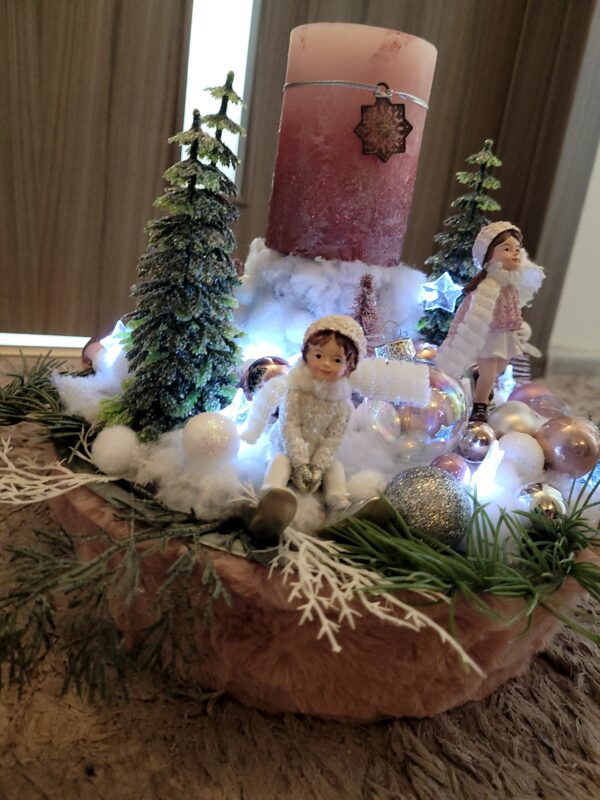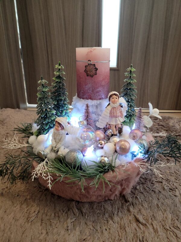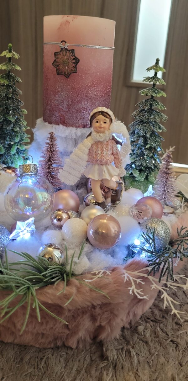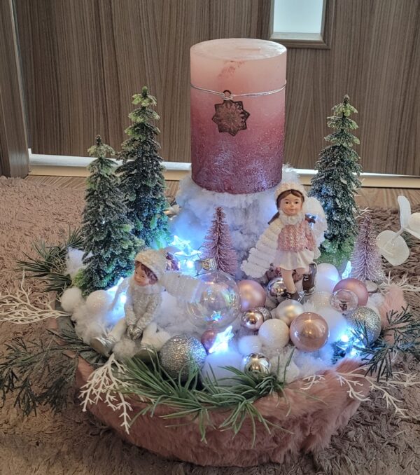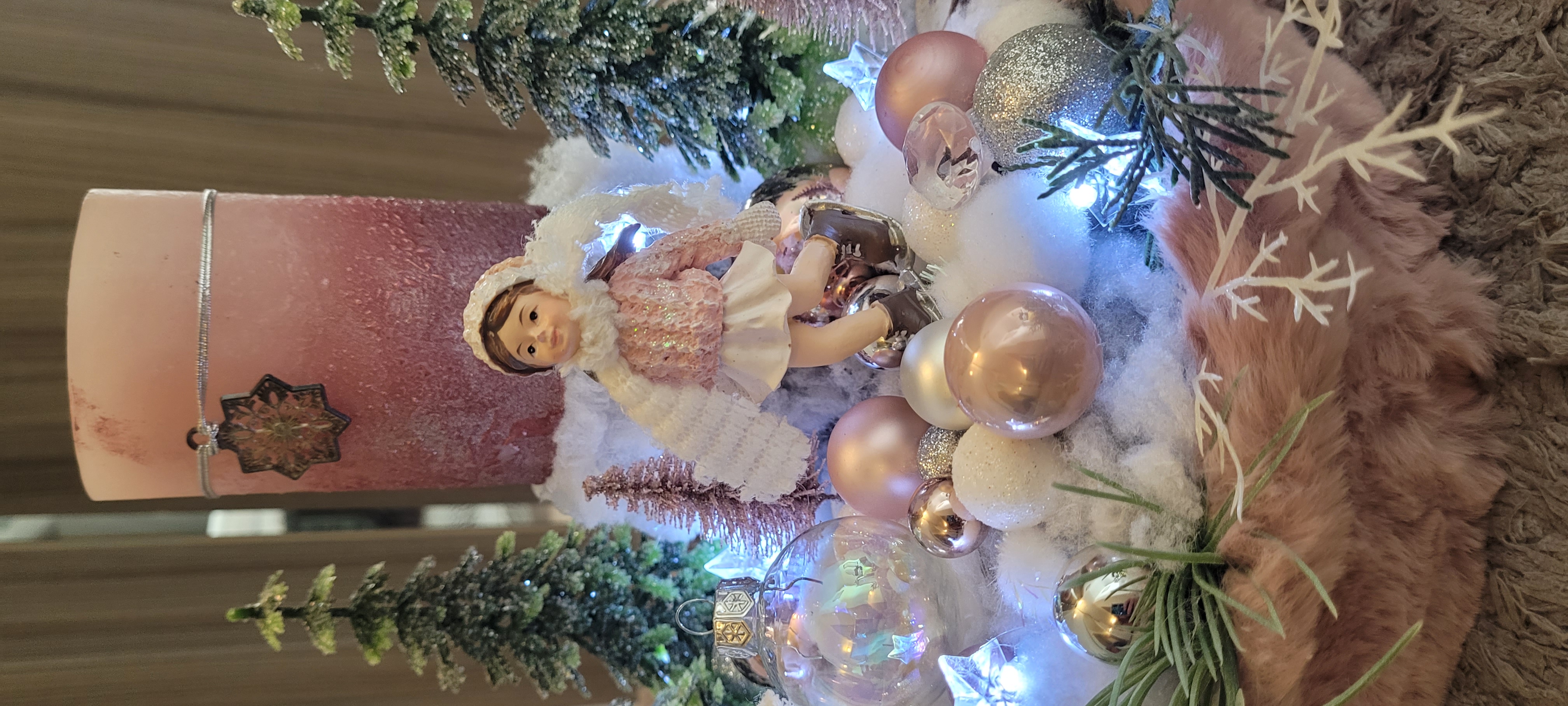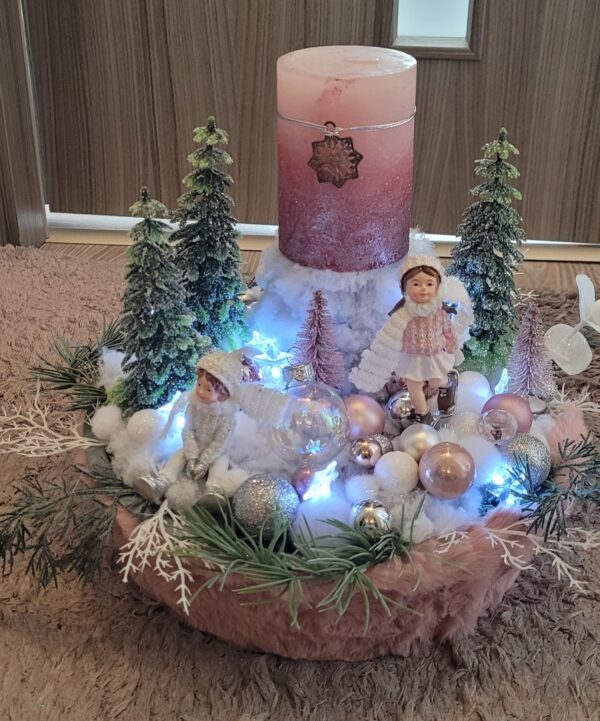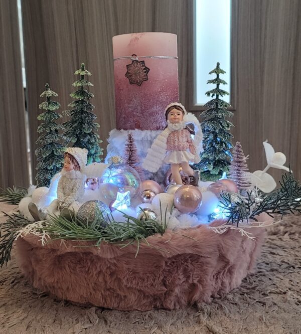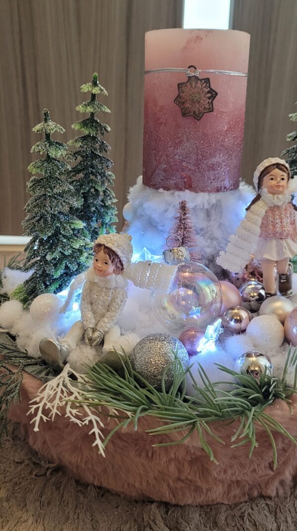 Vánoční dekorace Růžové děti se svíčkou a světýlky. Základna 28 cm. Trafíčko na baterie schované v kožíšku.