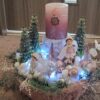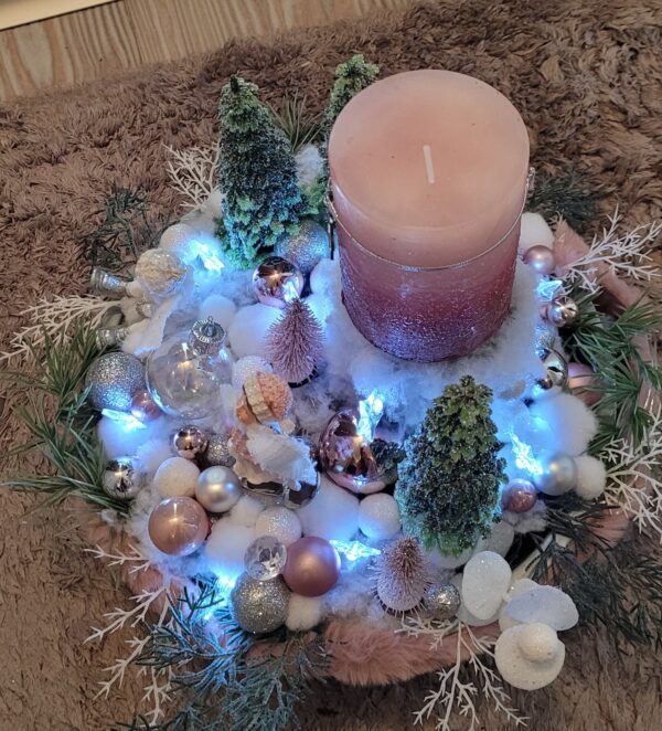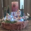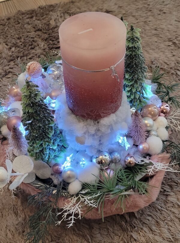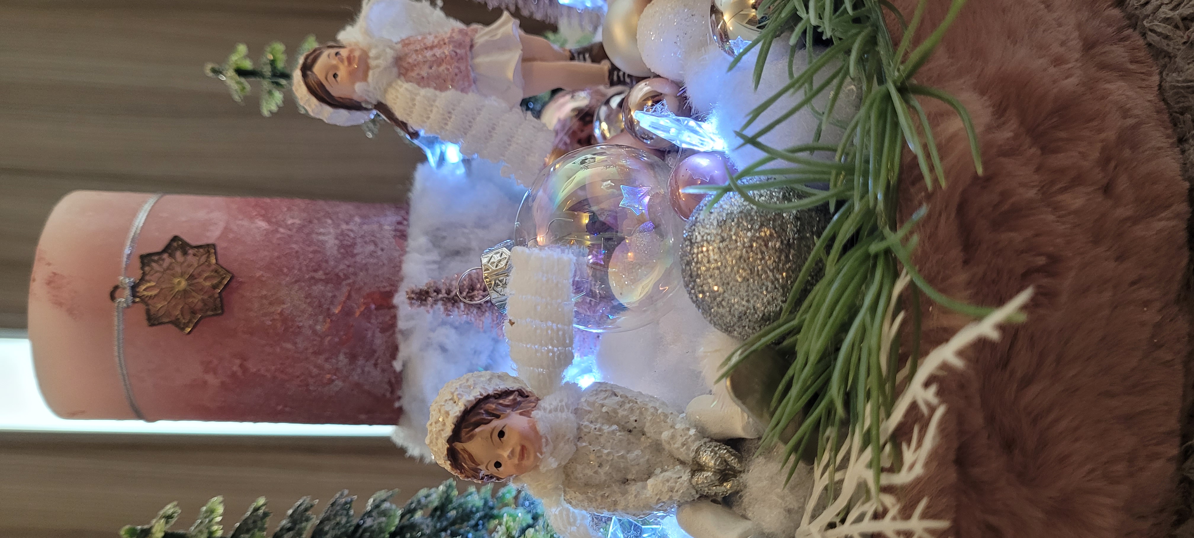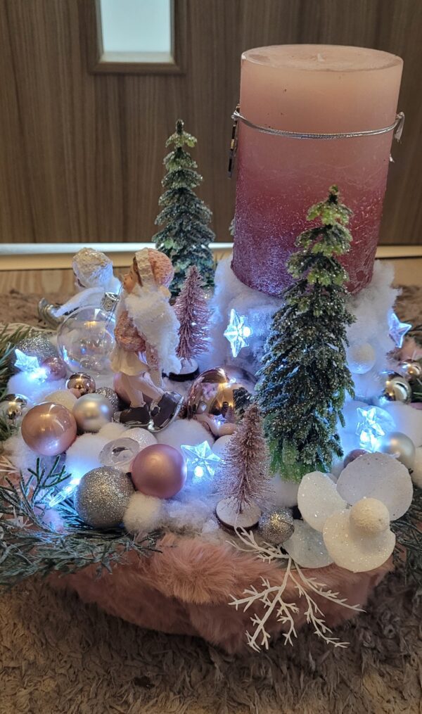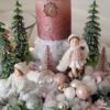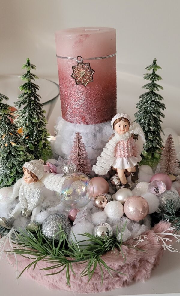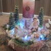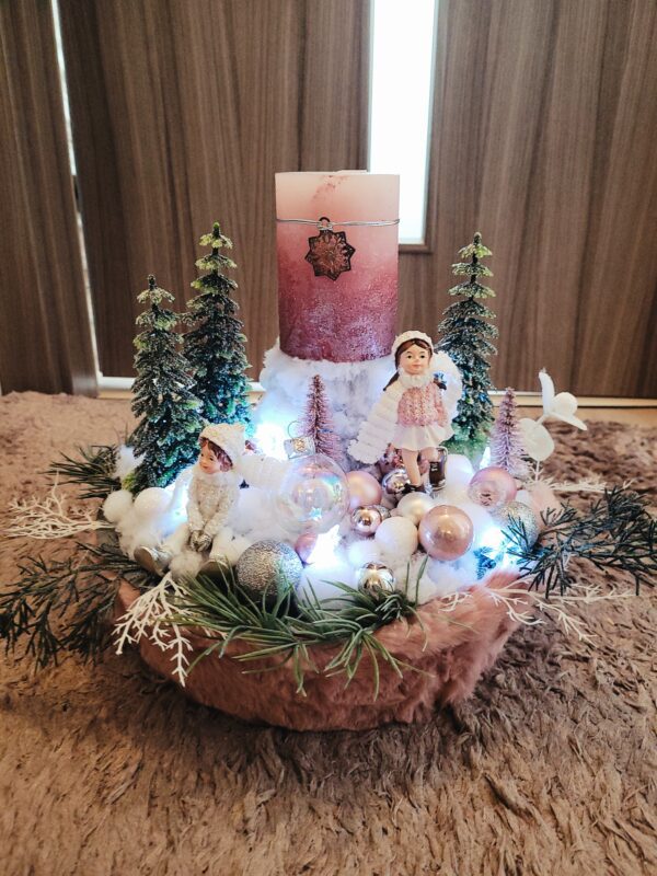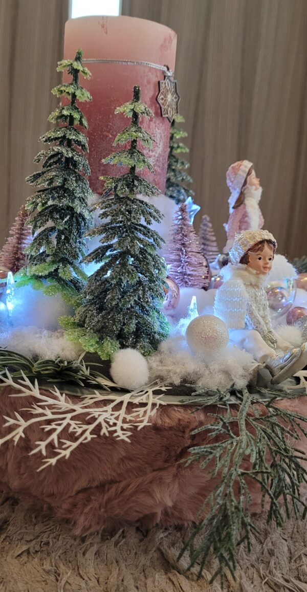 Vánoční dekorace Růžové děti se svíčkou a světýlky. Základna 28 cm. Trafíčko na baterie schované v kožíšku.