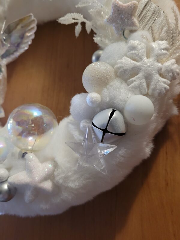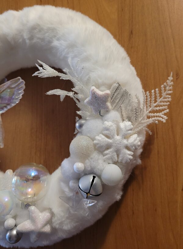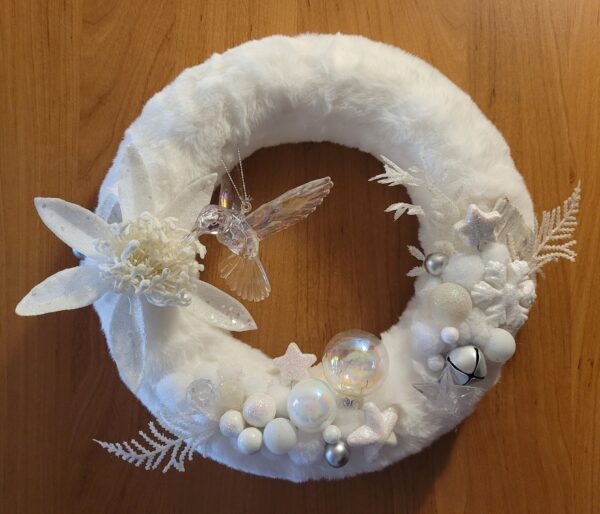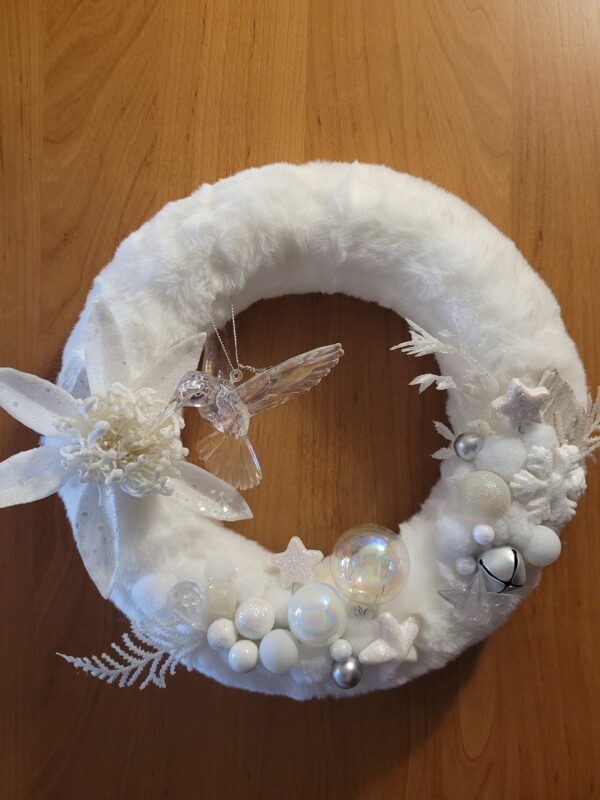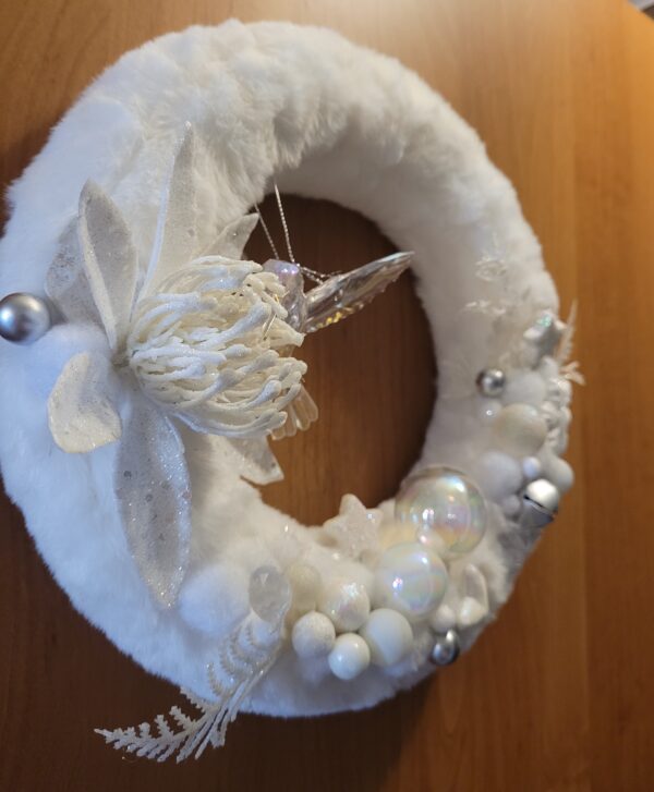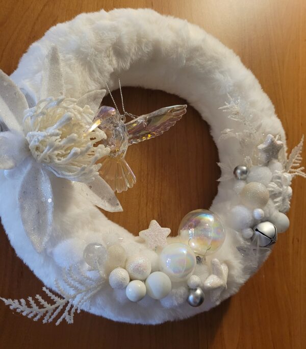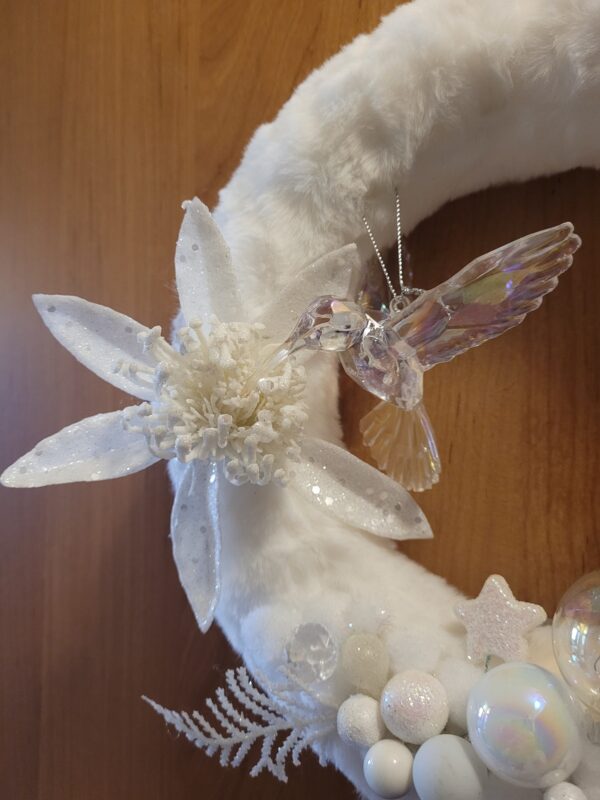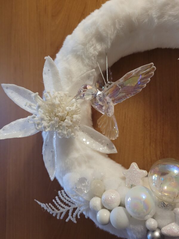 Chlupatý vánoční věnec na dveře s Kolibříkem. Průměr 28cm. Skleněné baňky,trvanlivá květina, kolibřík…