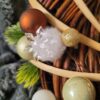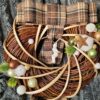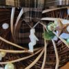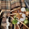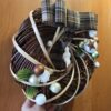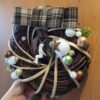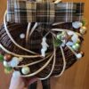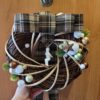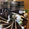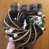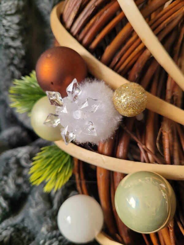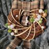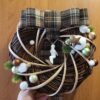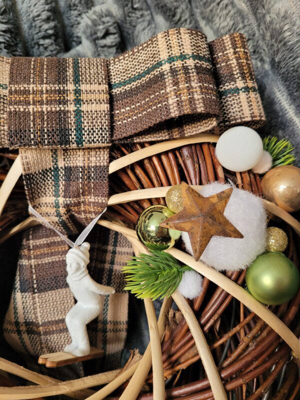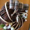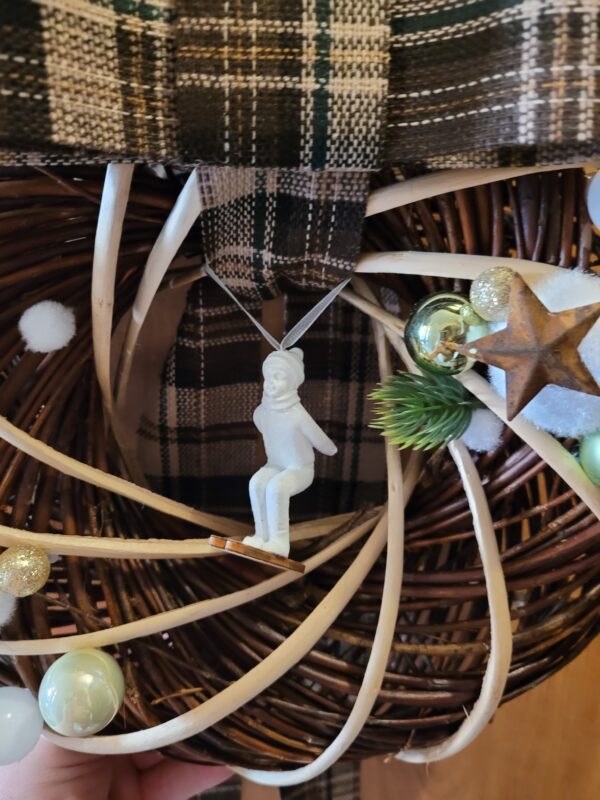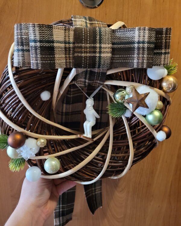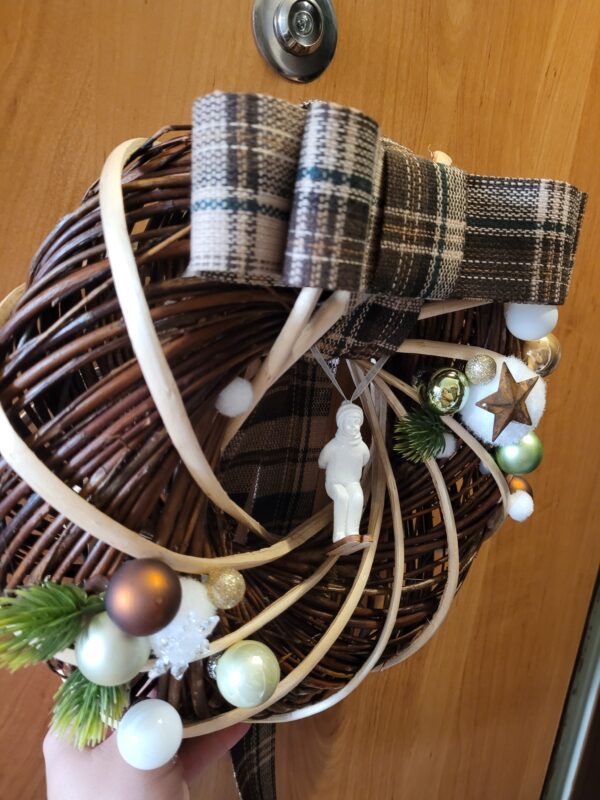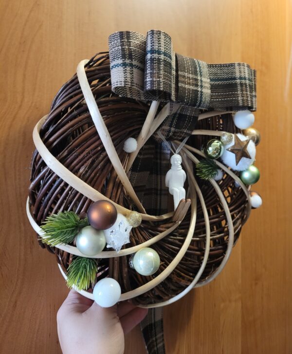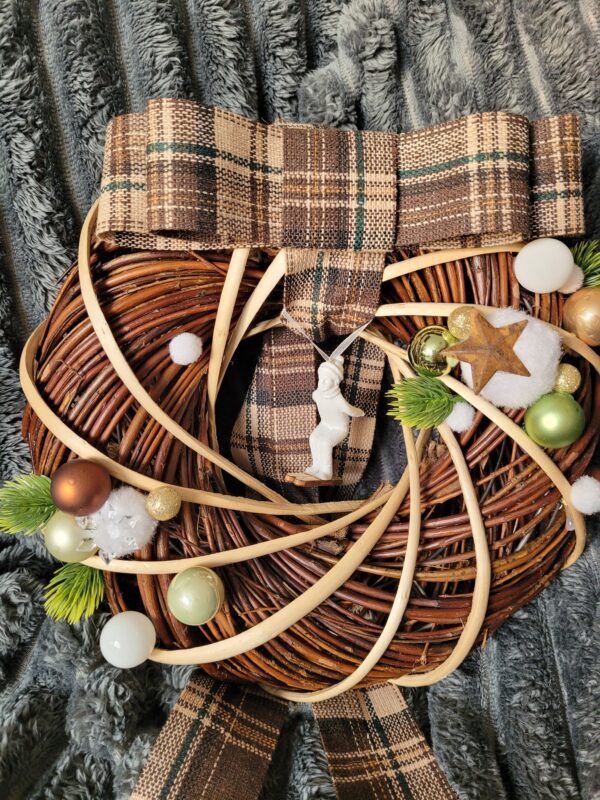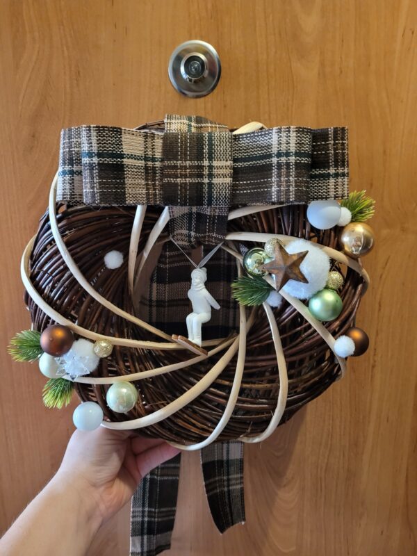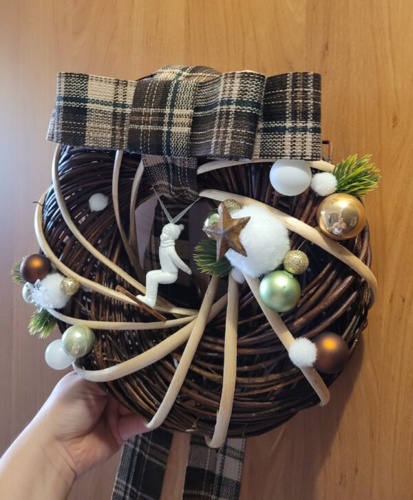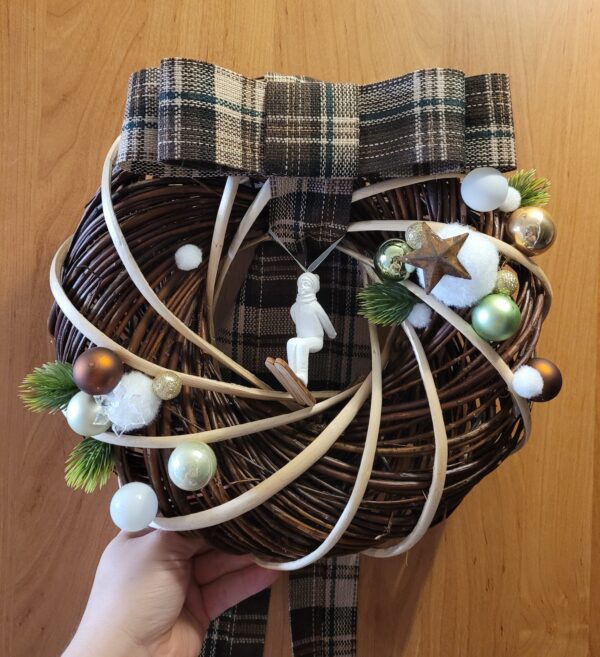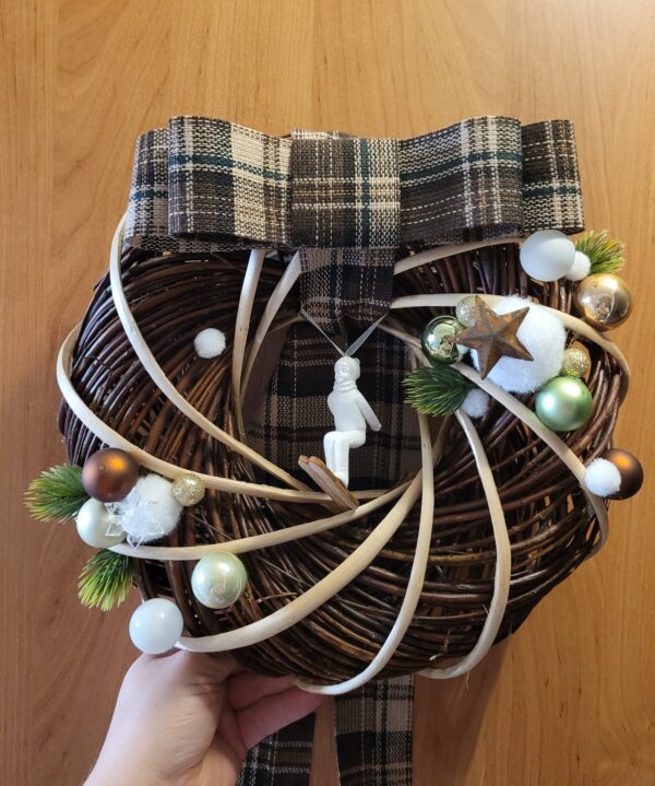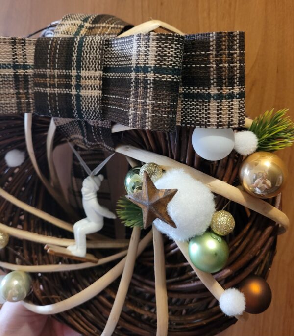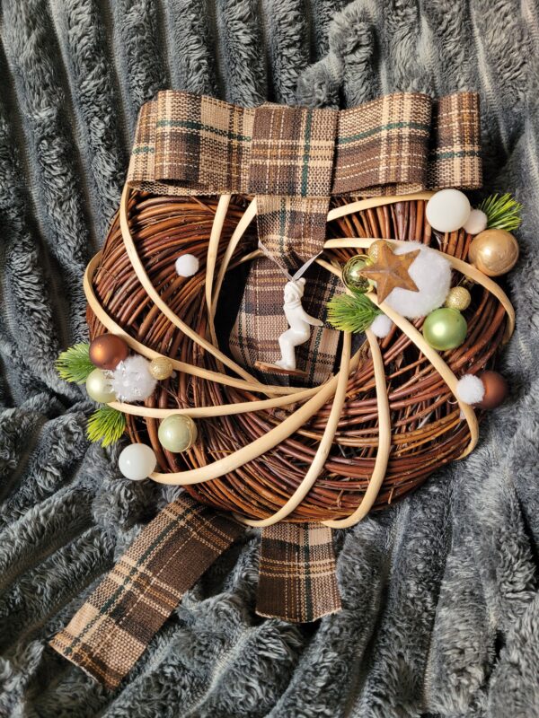 Vánoční věnec na dveře Lyžař v hnědých tónech. Proutí, sklenené baňky, velká látková hrubá stuha.