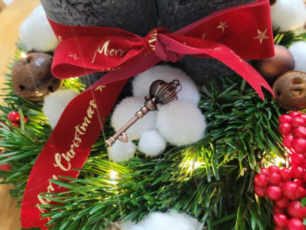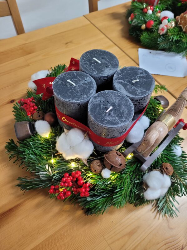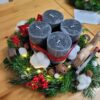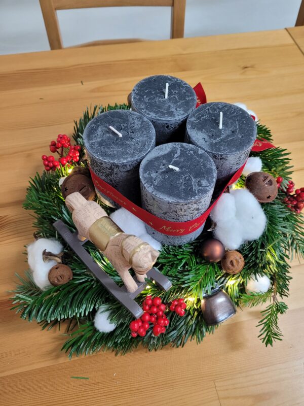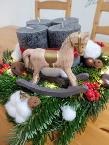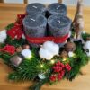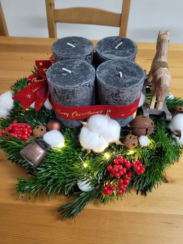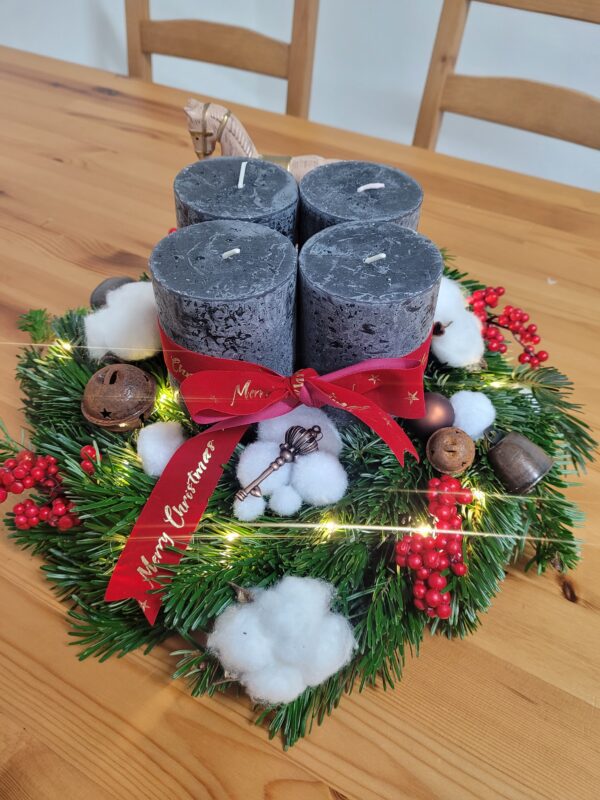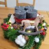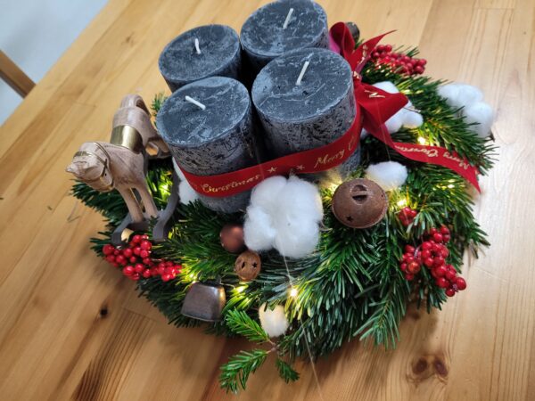 Živý adventní věnec s koníčkem s různých barevných variantách. Zvolte si tu vaší. Základna na svíčky uprostřed s osvětlením. Průměr 25cm.